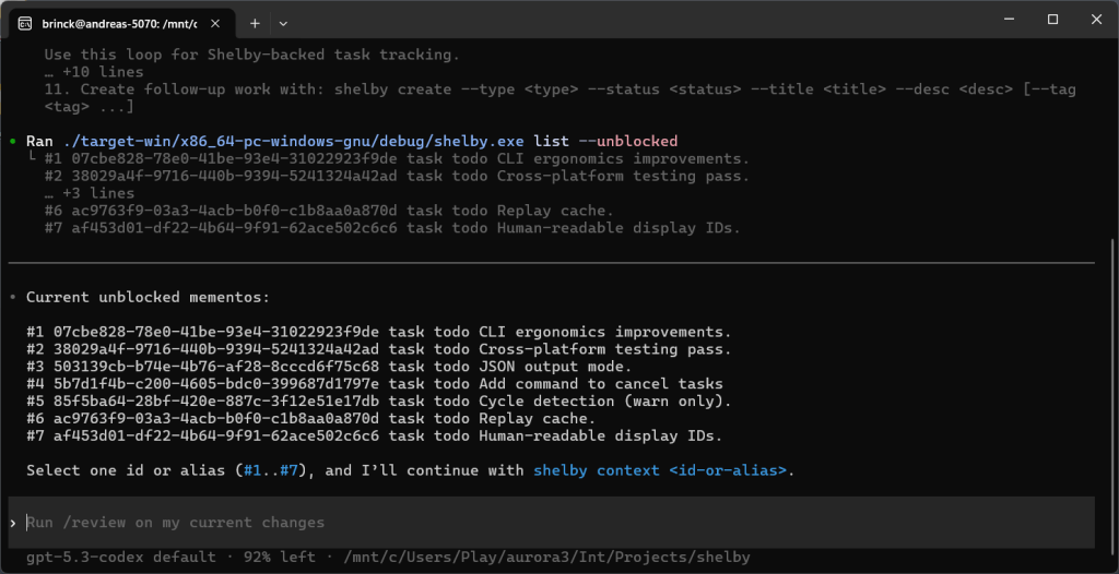 shelby help agent, which presents information on how to set up the development loop inAGENTS.mdgoing forward. - Fundamentally, the structure is the same as Beads. Data is recorded in an append-only JSONL event log stored directly in the repository. I call these records mementos. All Shelby commands start by replaying the log to reconstruct the current state.